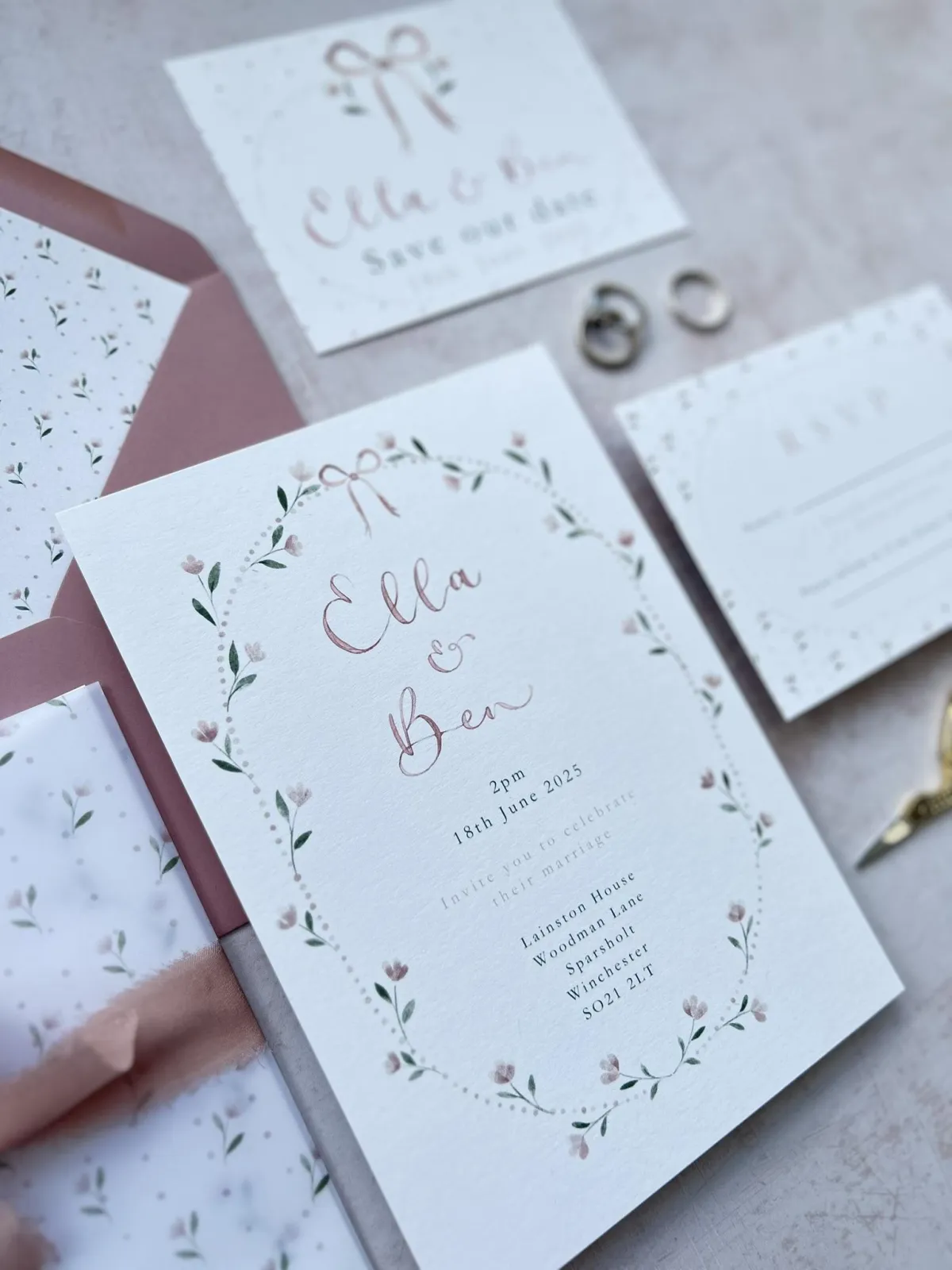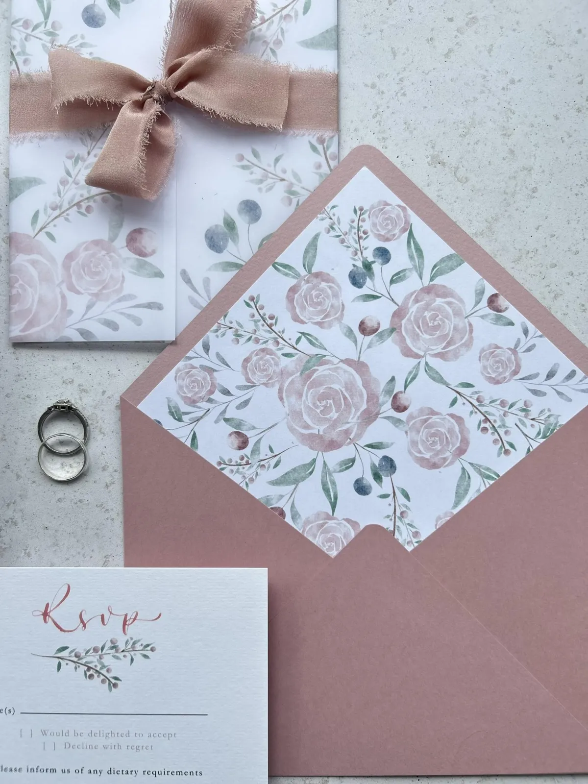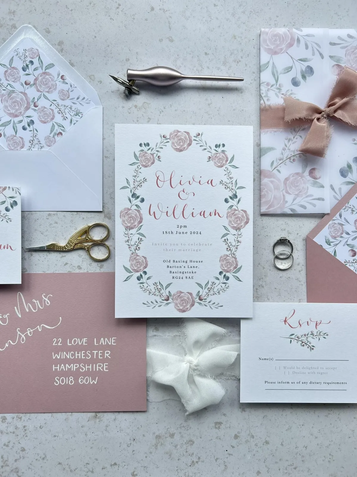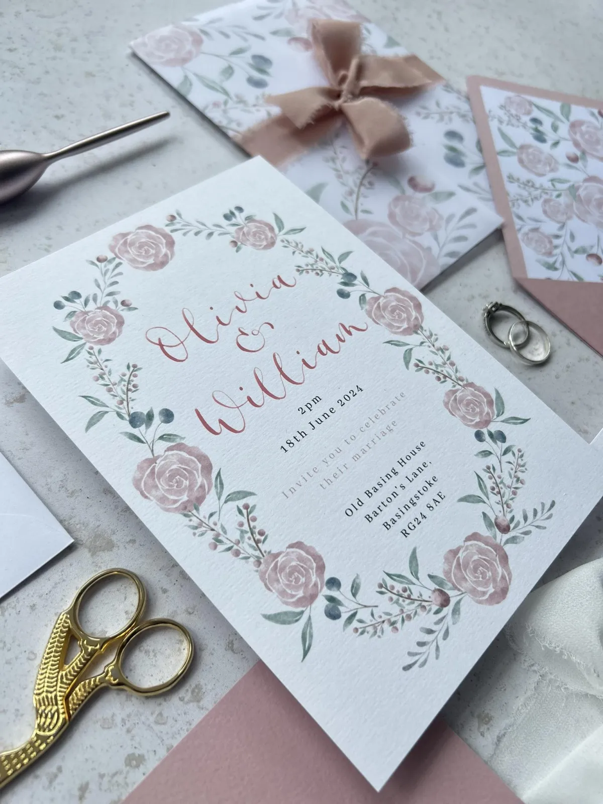 The Rose Garden features loose pink watercolour florals, arranged in an oval shape. Soft shades of sage mix beautifully with this dusty pink rose colour scheme. This suite comes with a number of optional luxury finishes such as hand tied silk ribbon, a wax seal, a printed vellum wrap, envelope liner and hand-lettered gold calligraphy.