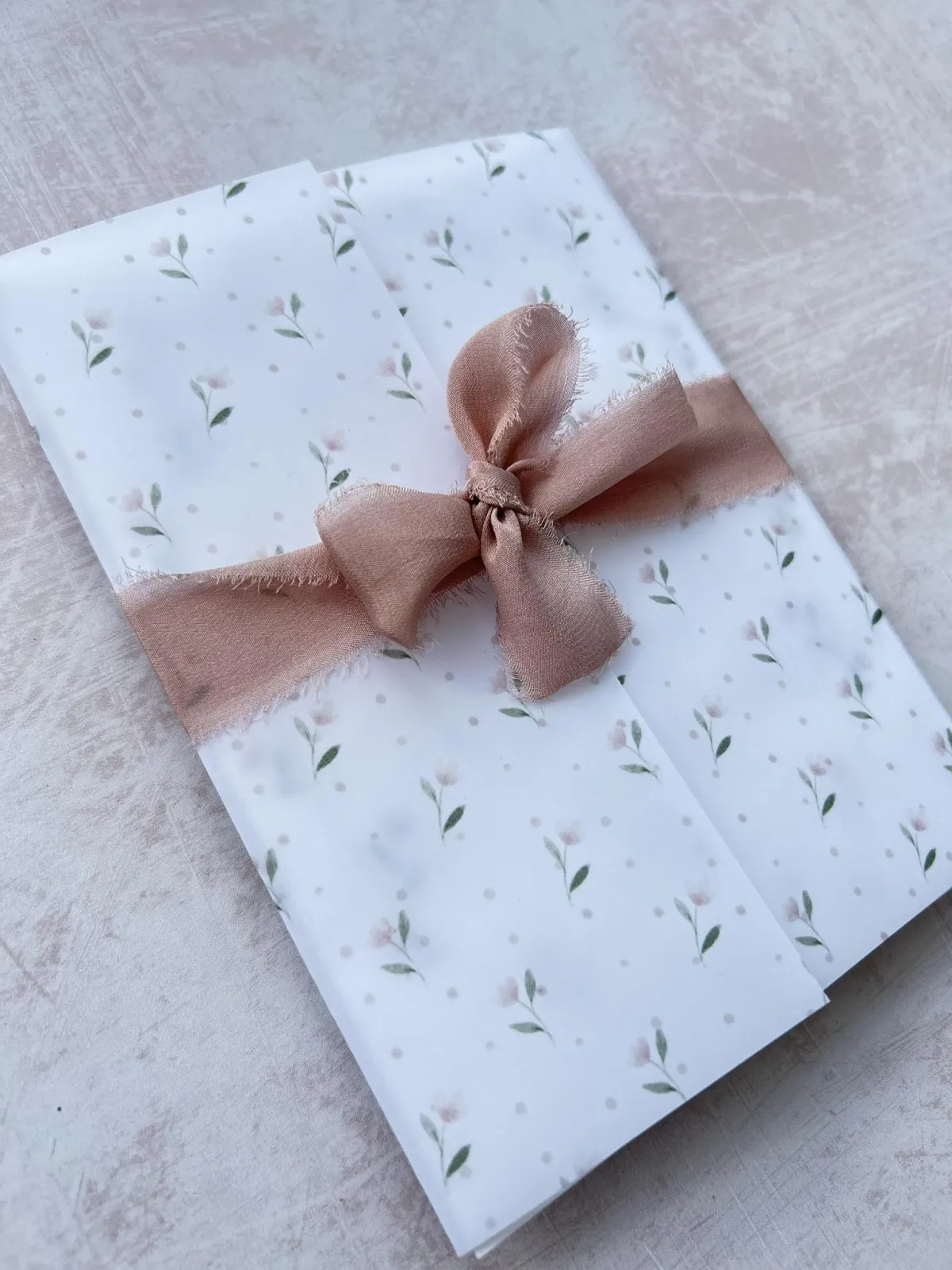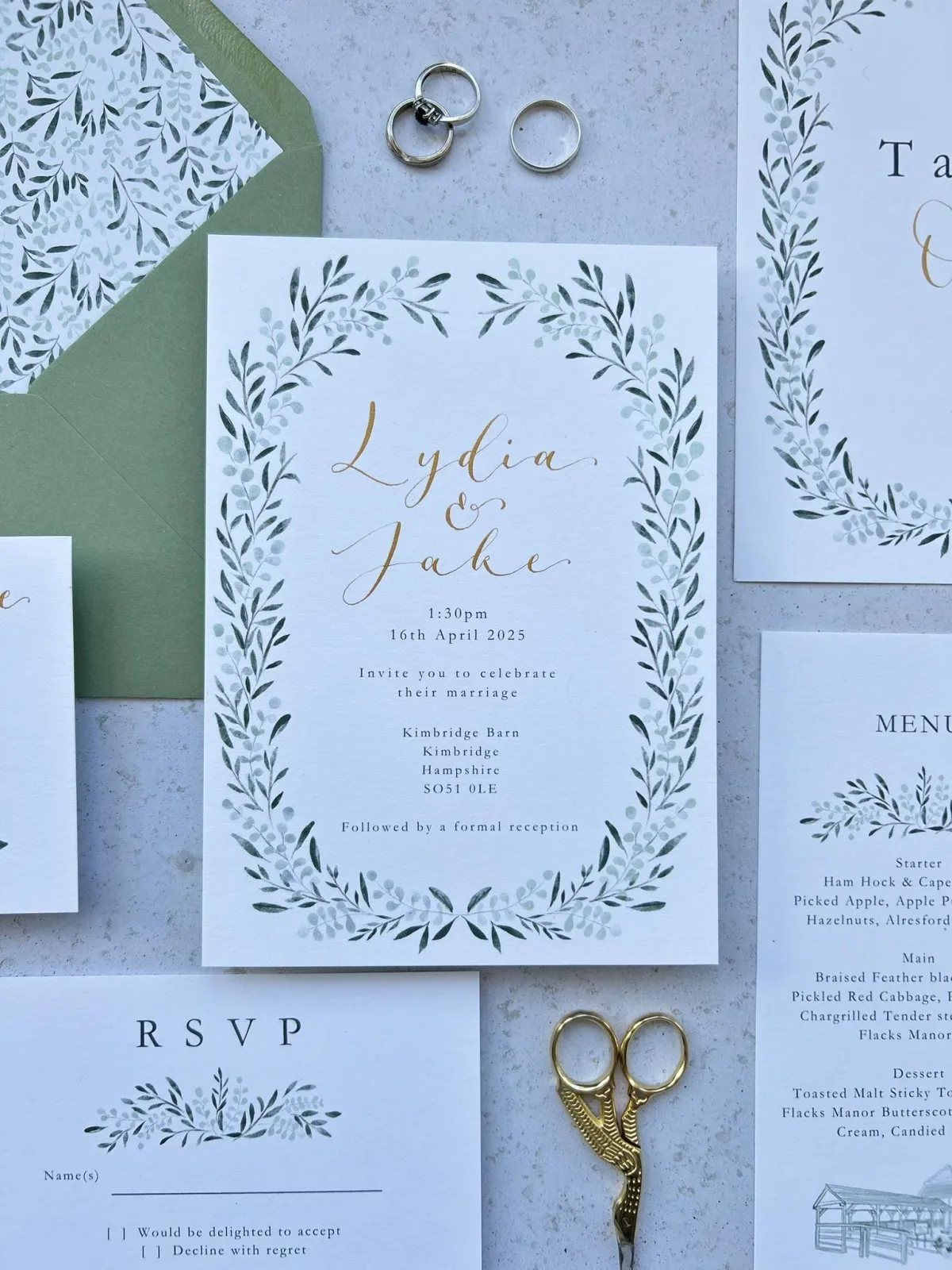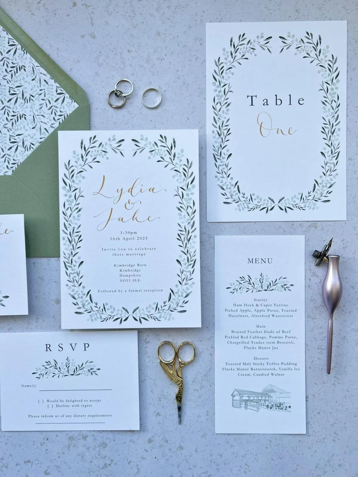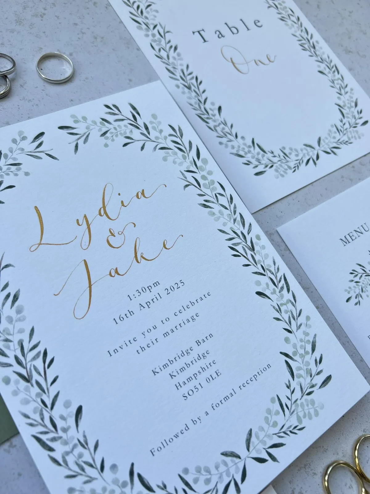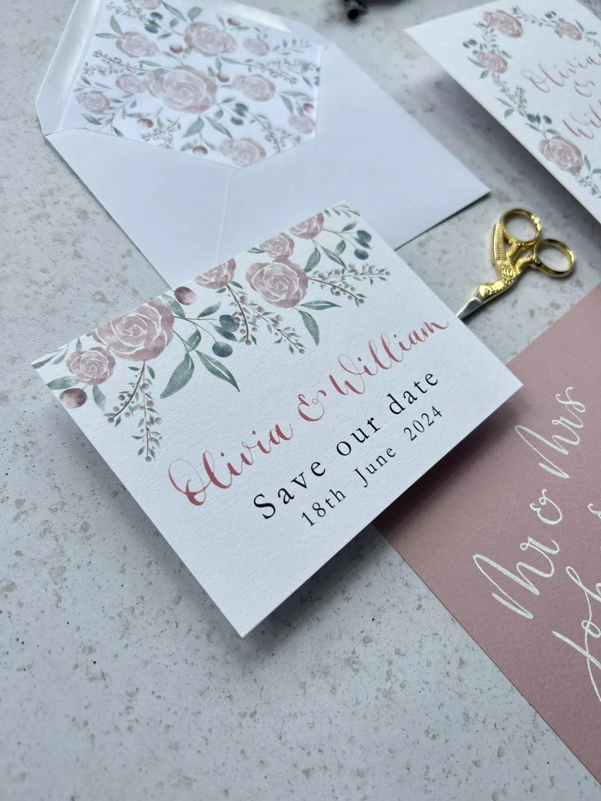 The Rose Garden features loose pink watercolour florals, arranged in an oval shape. Soft shades of sage mix beautifully with this dusty pink rose colour scheme. This suite comes with a number of optional luxury finishes such as hand tied silk ribbon, a wax seal, a printed vellum wrap, envelope liner and hand-lettered gold calligraphy.