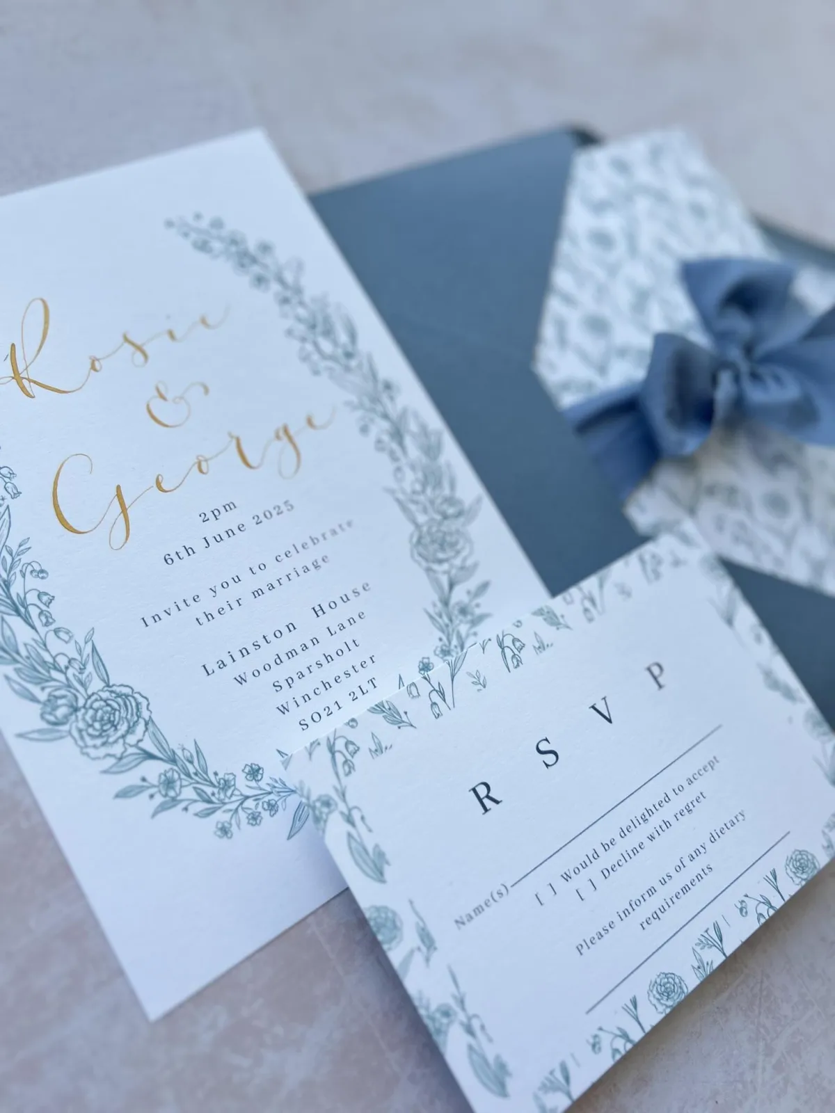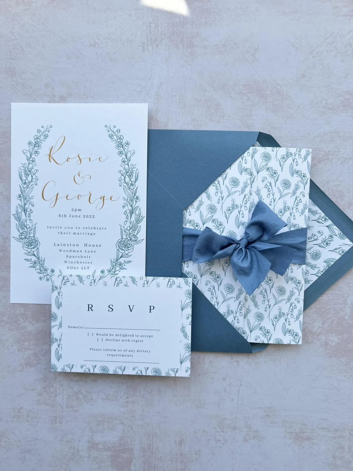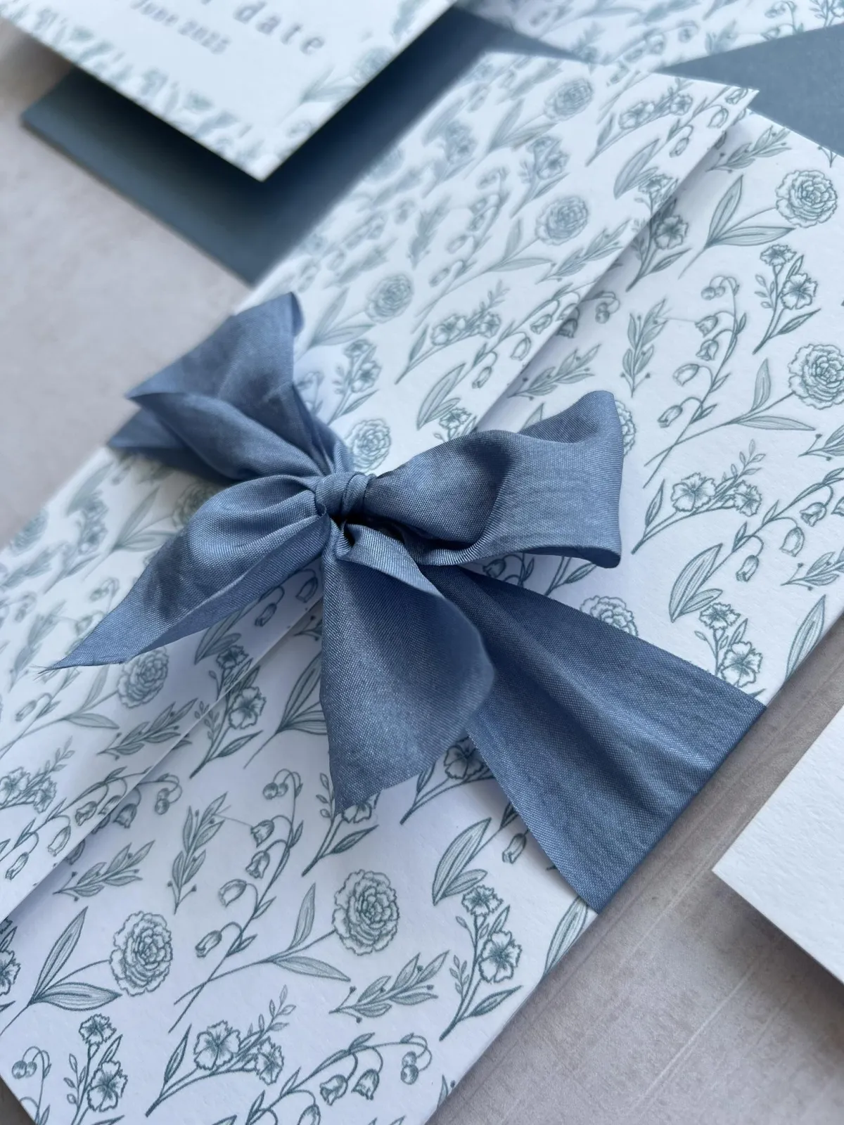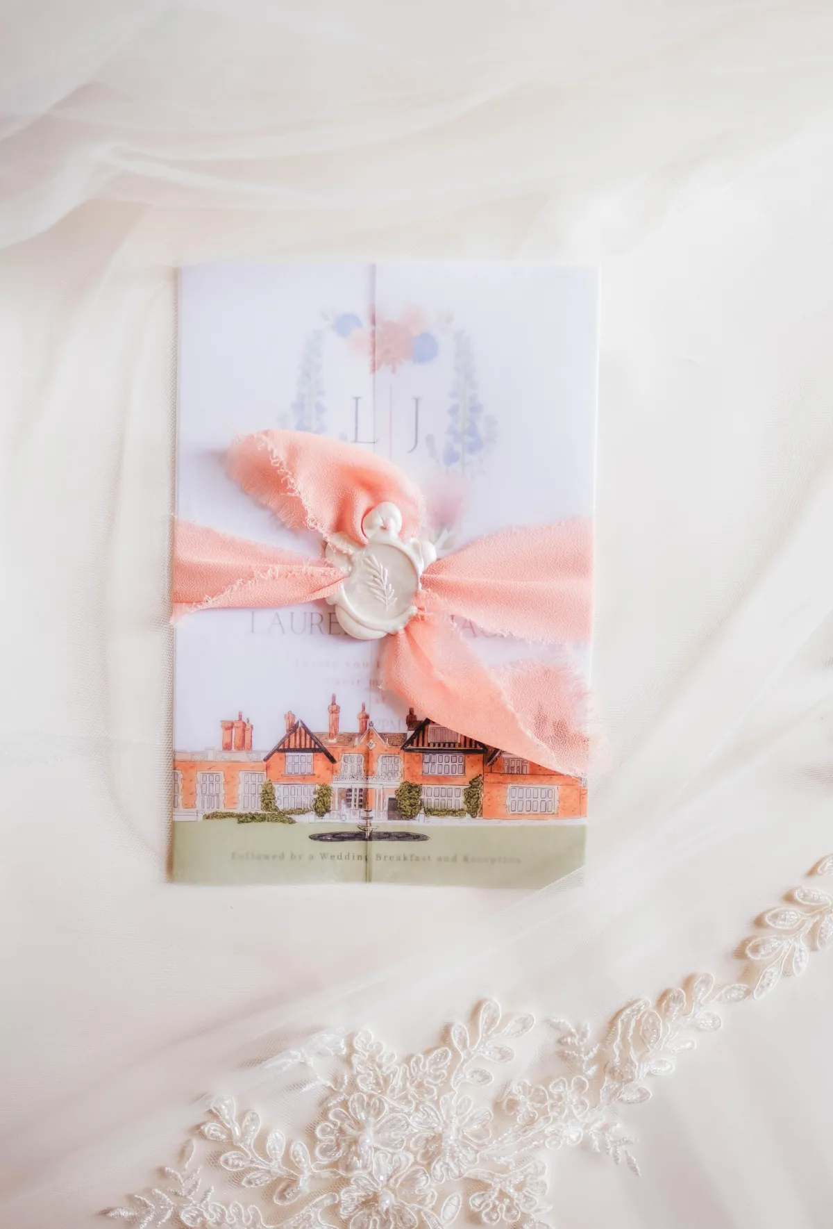 This suite comes with a number of optional luxury finishes such as hand tied silk ribbon, a wax seal, a printed vellum wrap, envelope liner and hand-lettered gold calligraphy.