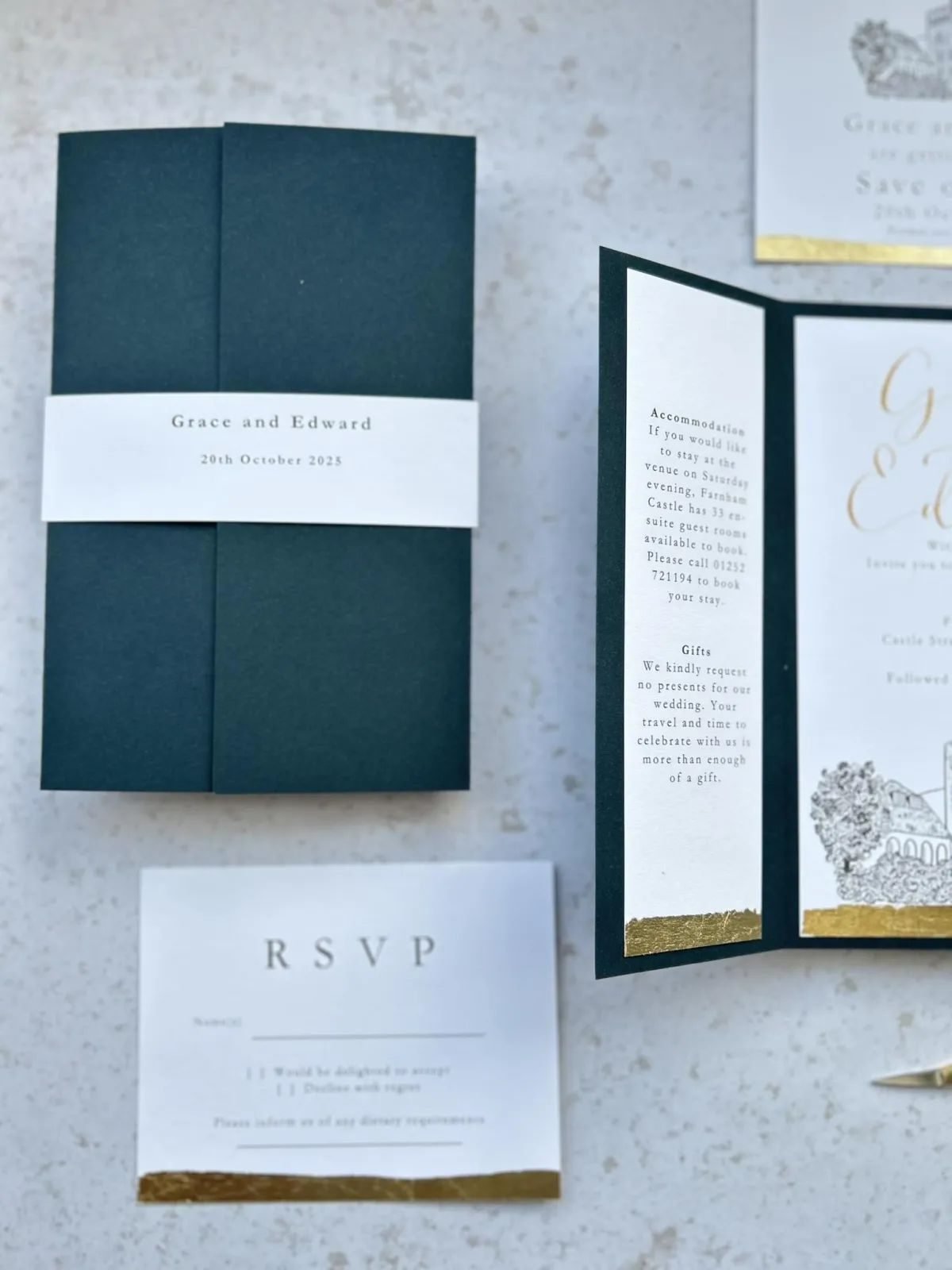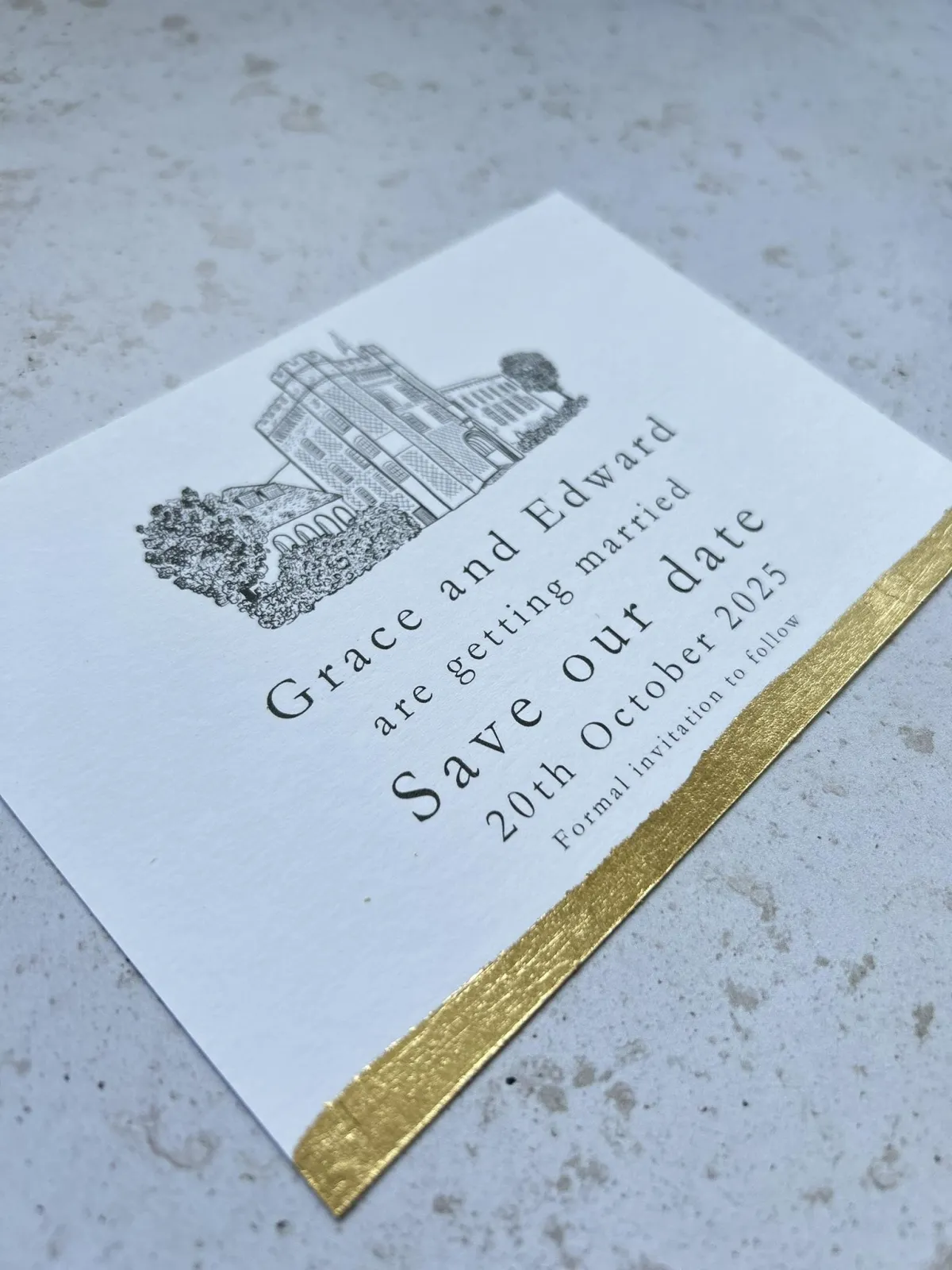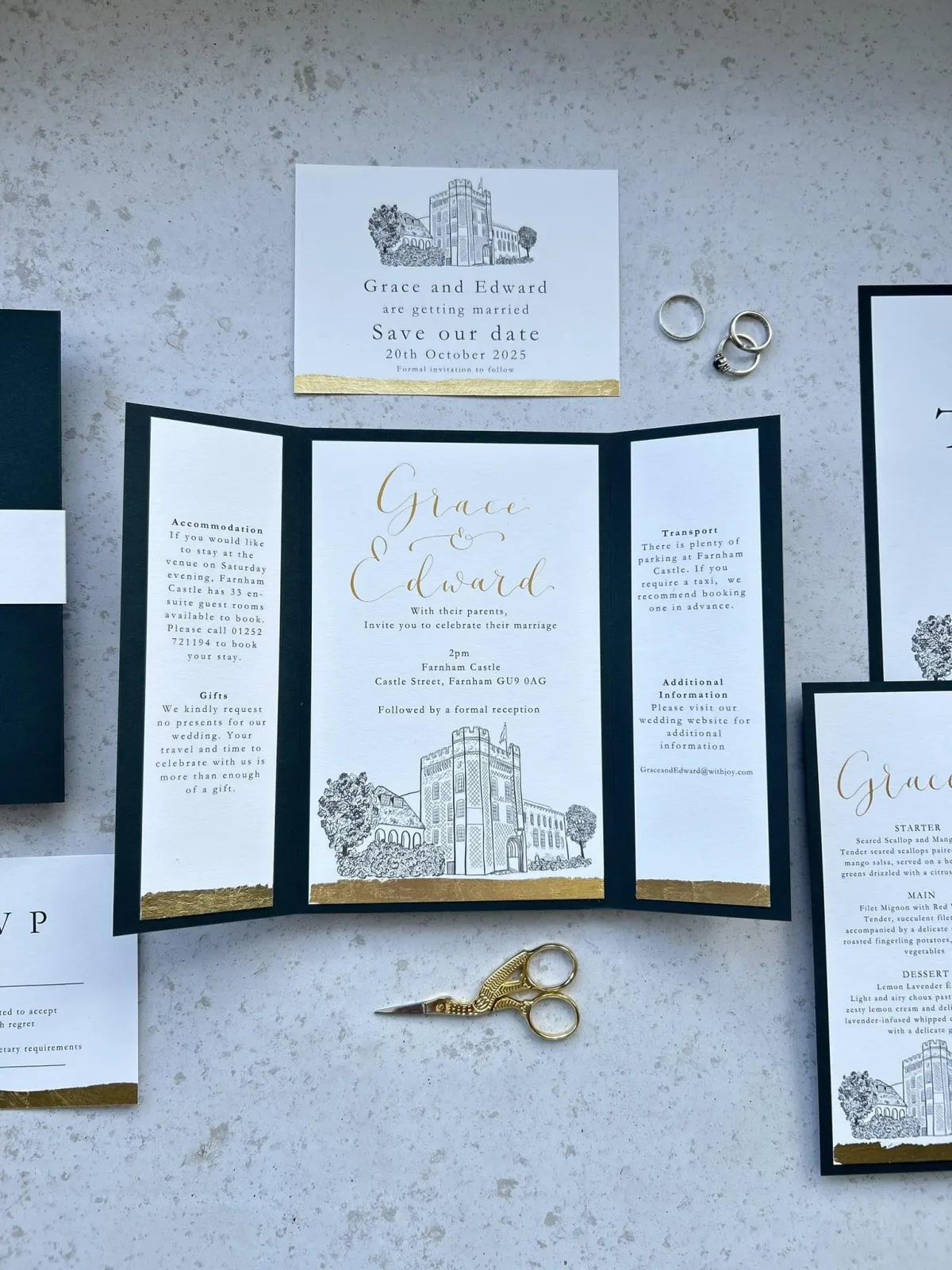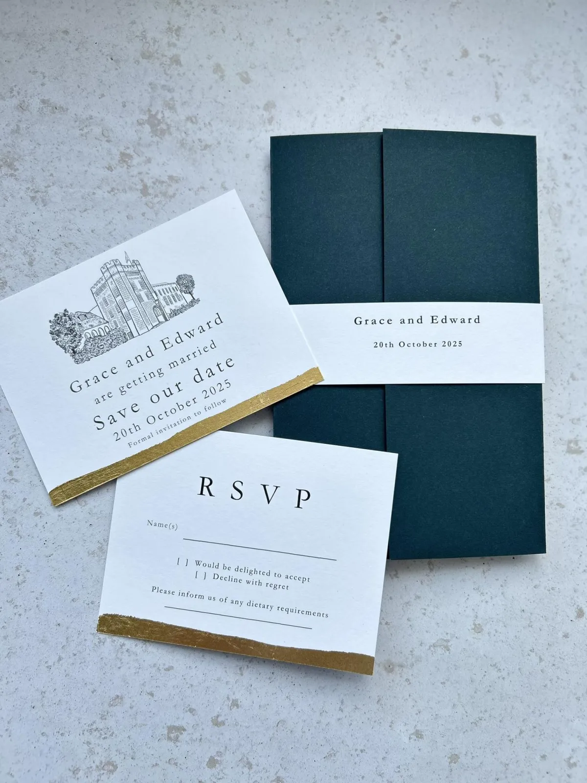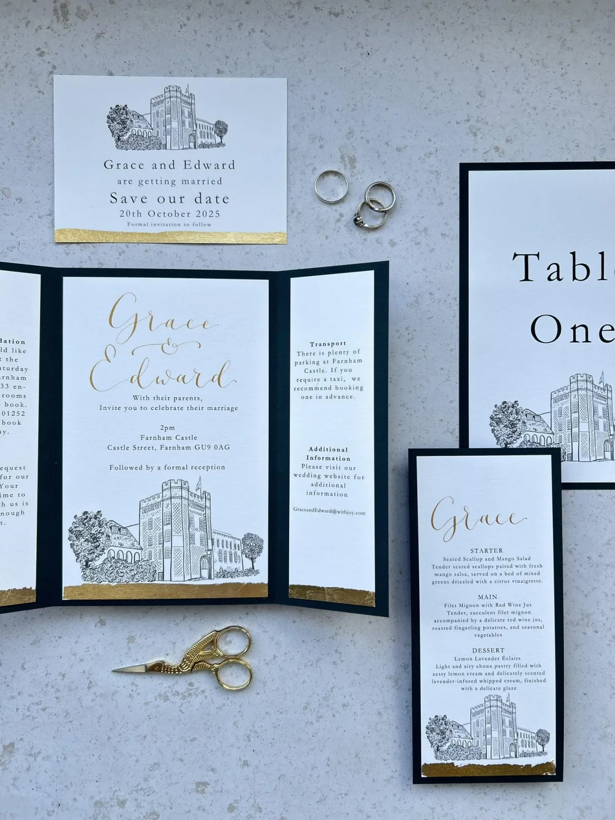The Venue Collection features a stylish venue illustration of your chosen venue. Venue illustrations are very popular and really give your guests a sneak peak into your special day. This suite comes with a number of optional luxury finishes such as hand tied silk ribbon, a wax seal, a printed vellum wrap, envelope liner and hand-lettered gold calligraphy.