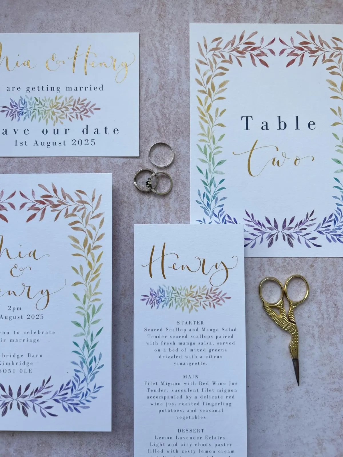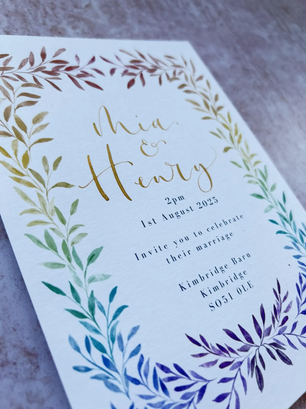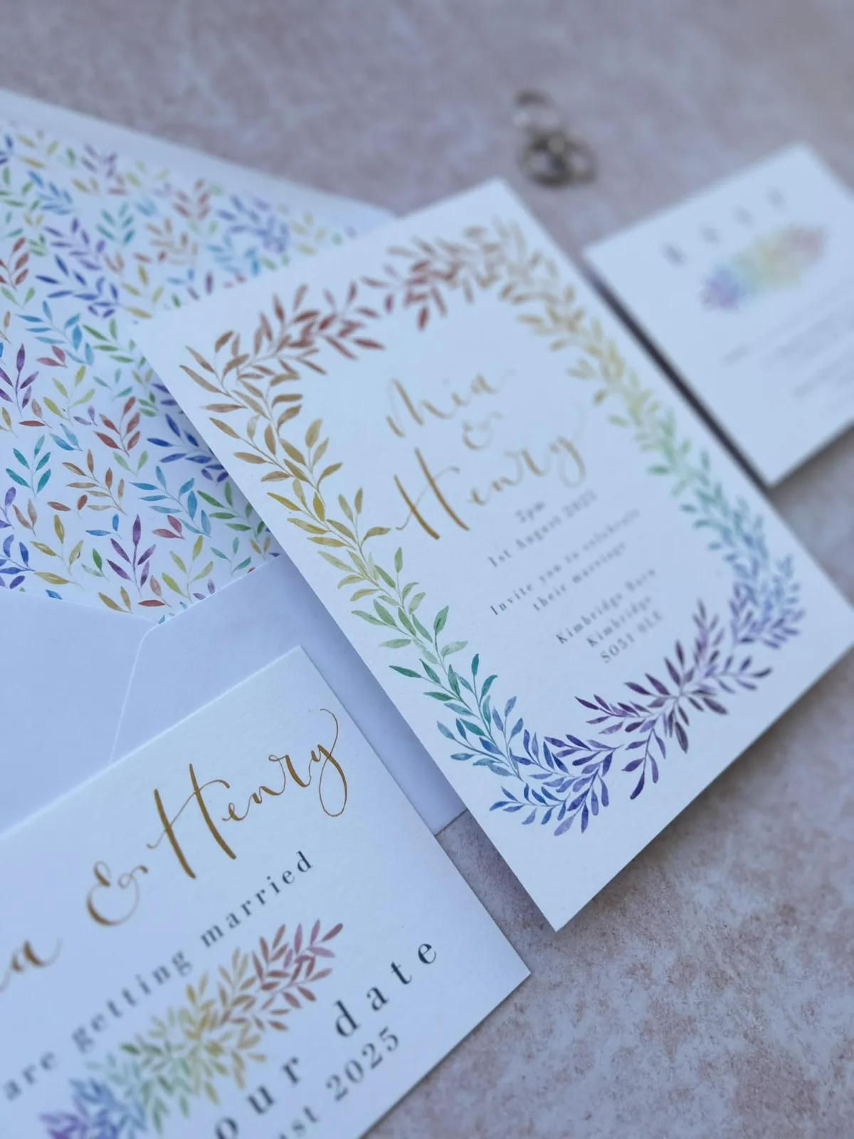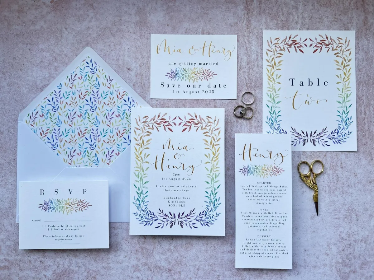 The Aurora features a delicate blend of colourful leaves. This design is perfect for the colourful couples who want to share a vibrant, yet sophisticated look with their guests. This suite comes with a number of optional luxury finishes such as hand tied silk ribbon, a wax seal, a printed vellum wrap, envelope liner and hand-lettered gold calligraphy.