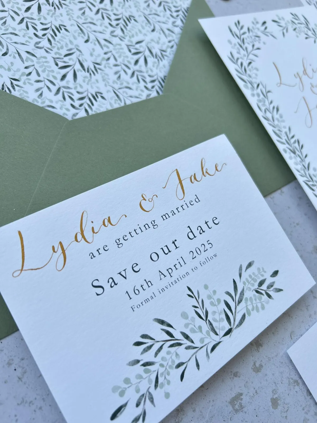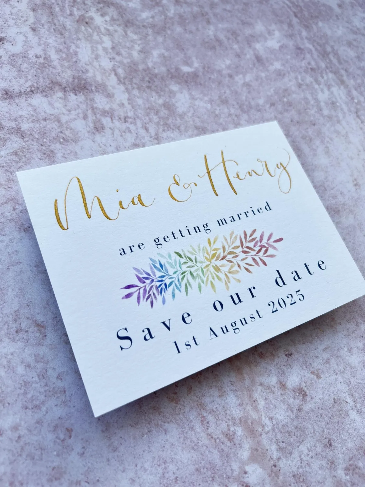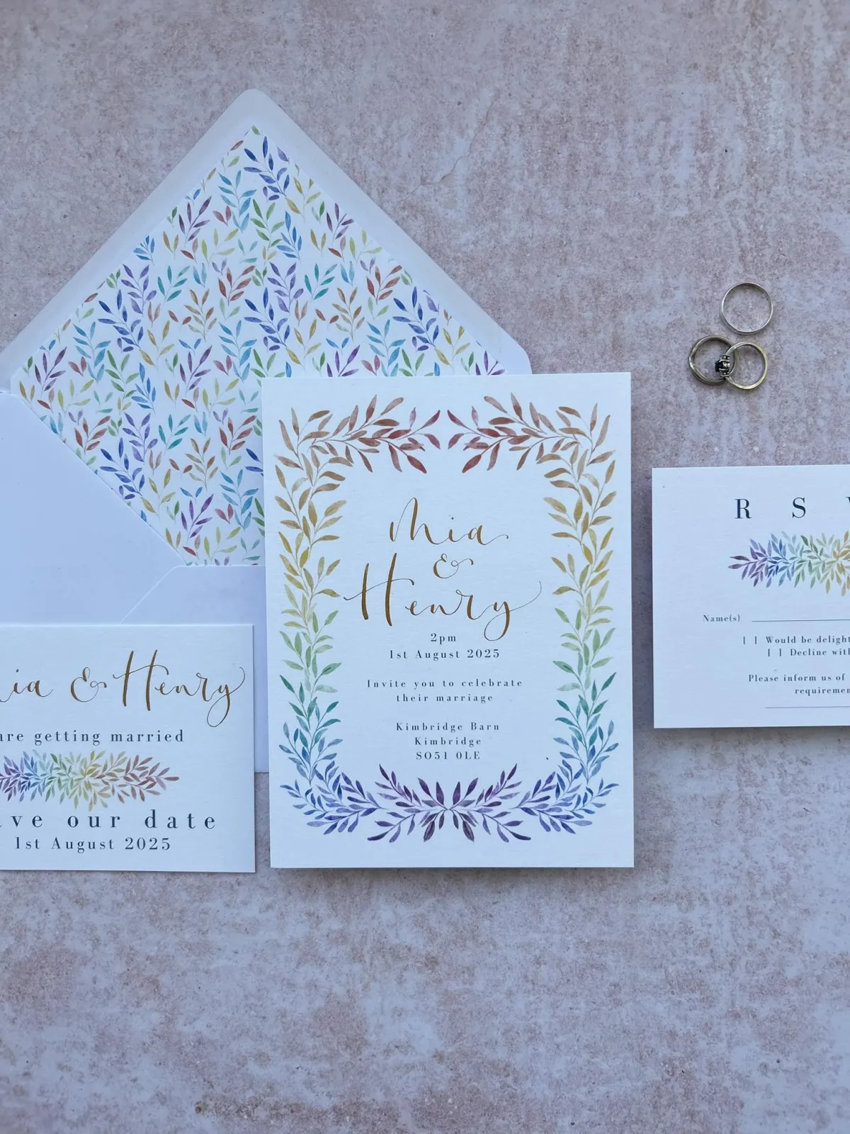 The Aurora features a delicate blend of colourful leaves. This design is perfect for the colourful couples who want to share a vibrant, yet sophisticated look with their guests. This suite comes with a number of optional luxury finishes such as hand tied silk ribbon, a wax seal, a printed vellum wrap, envelope liner and hand-lettered gold calligraphy.