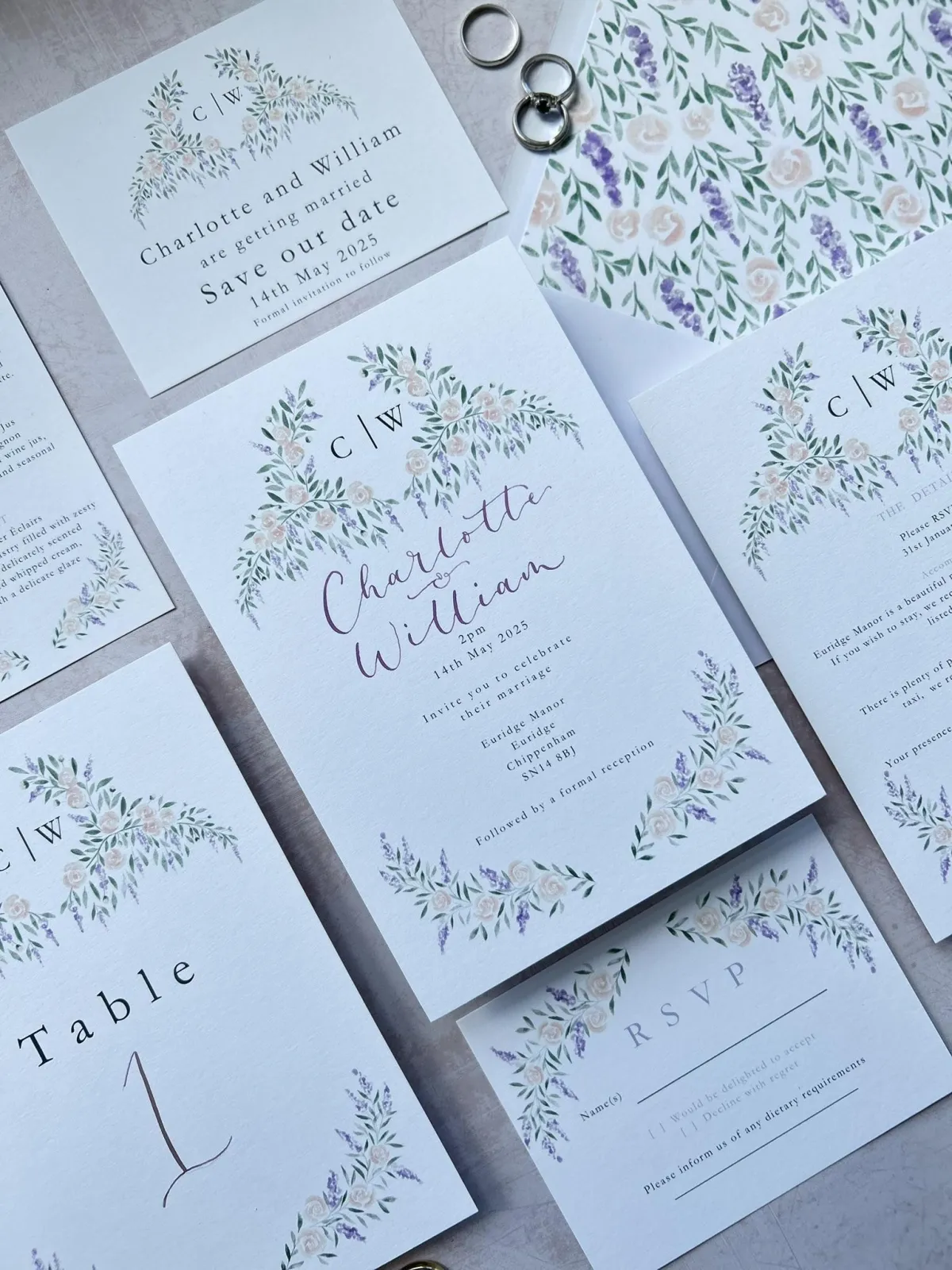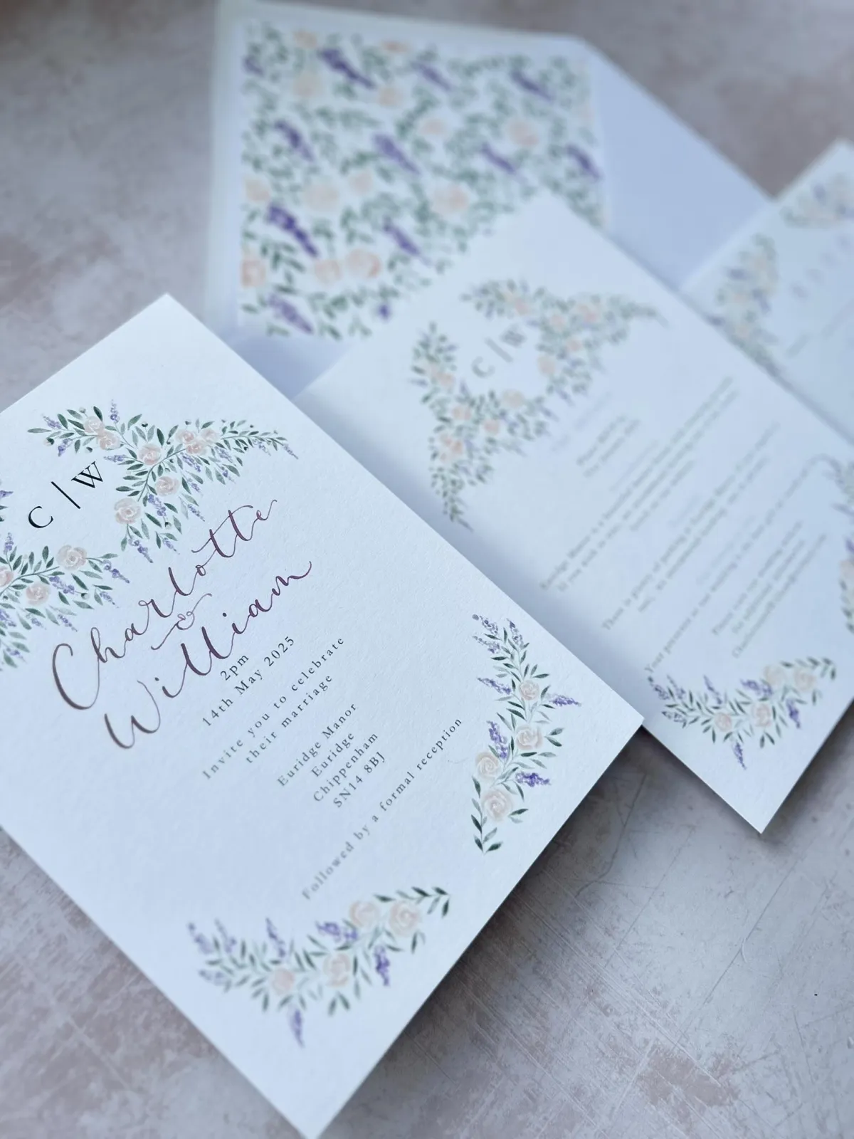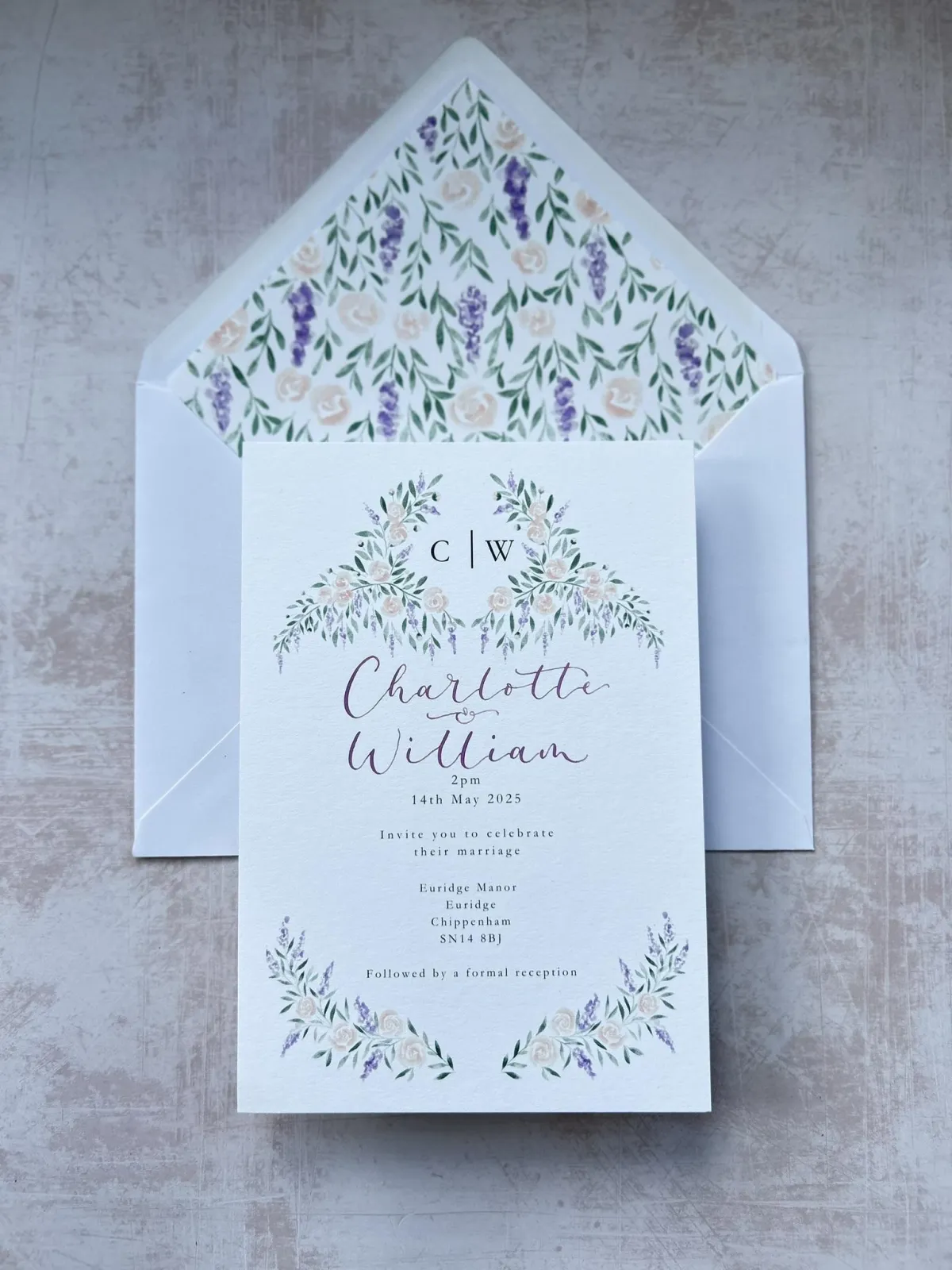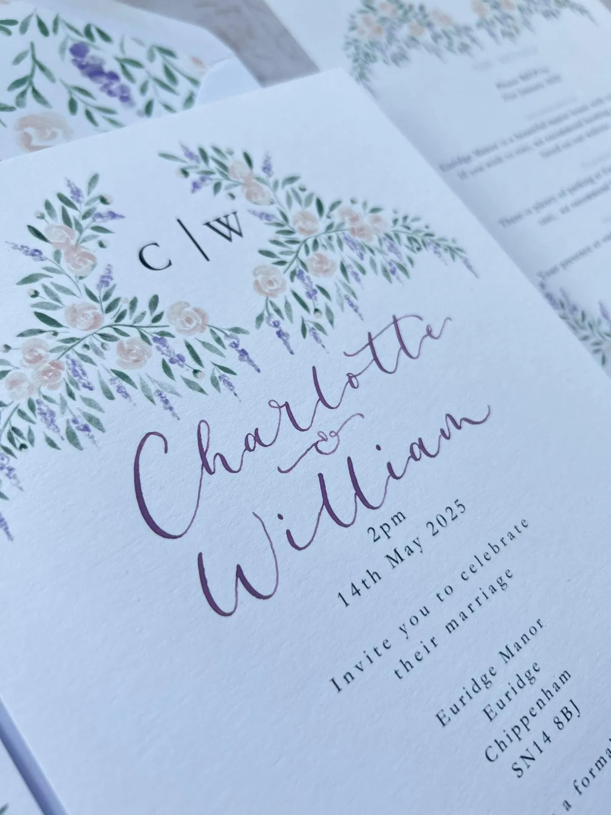 The Wisteria Garden is inspired by the beautiful wisteria we see blooming in May across Britain. The delicate tendrils of wisteria are balanced with dark green leaves and soft pink roses. This suite comes with a number of optional luxury finishes such as hand tied silk ribbon, a wax seal, a printed vellum wrap, envelope liner and hand-lettered gold calligraphy.