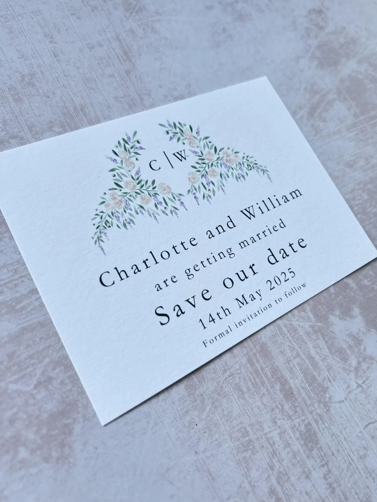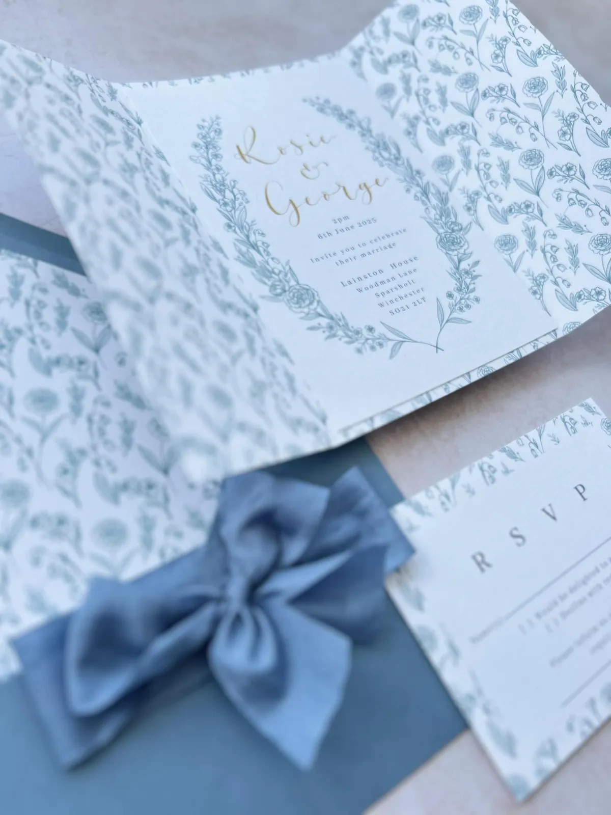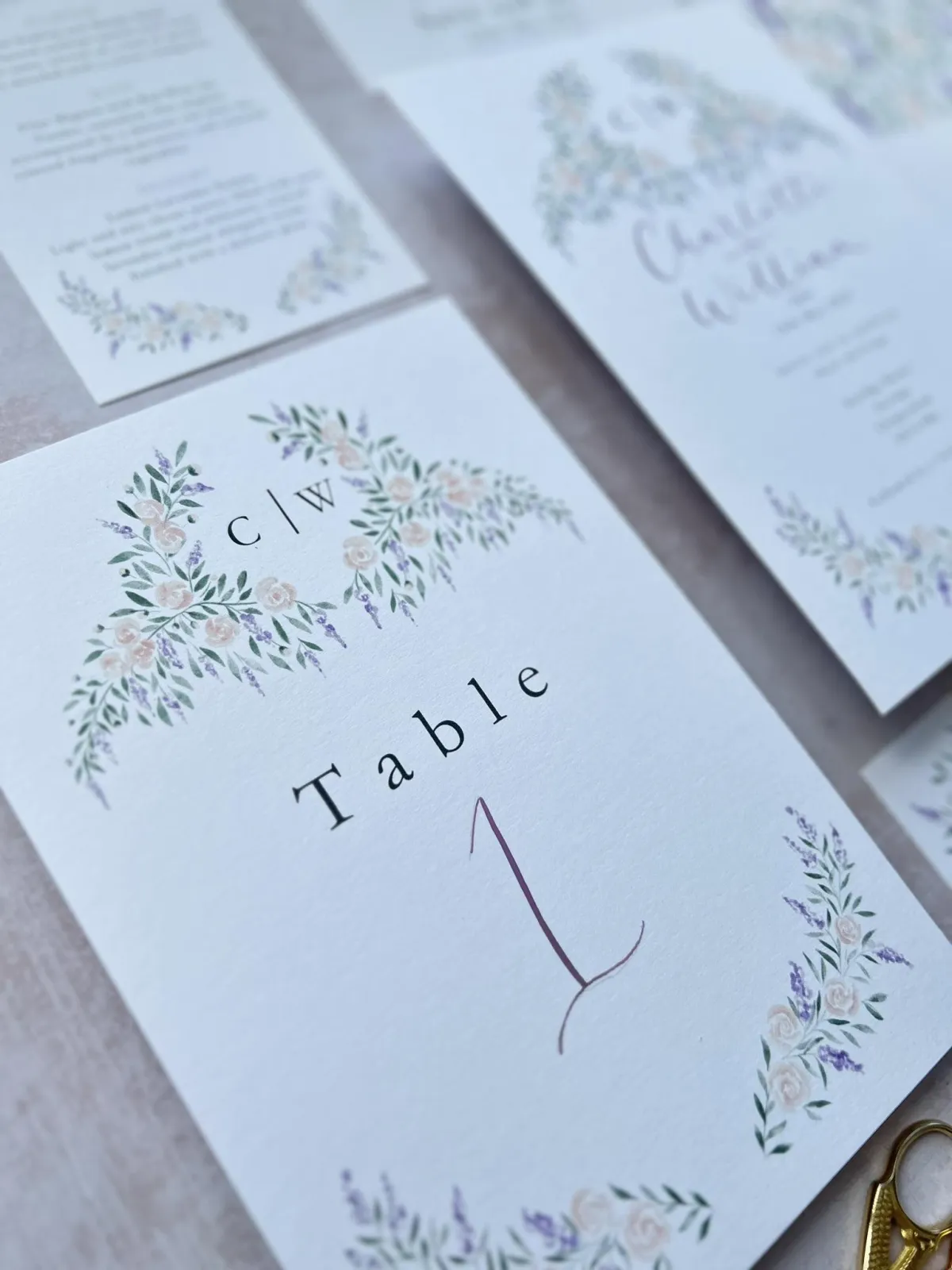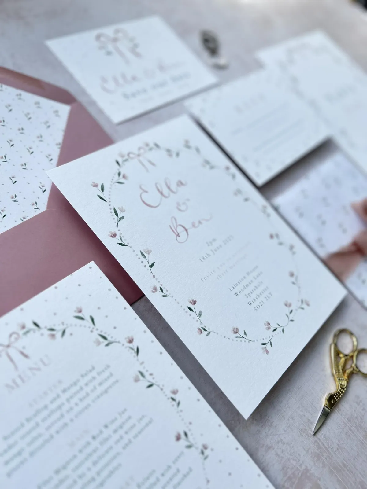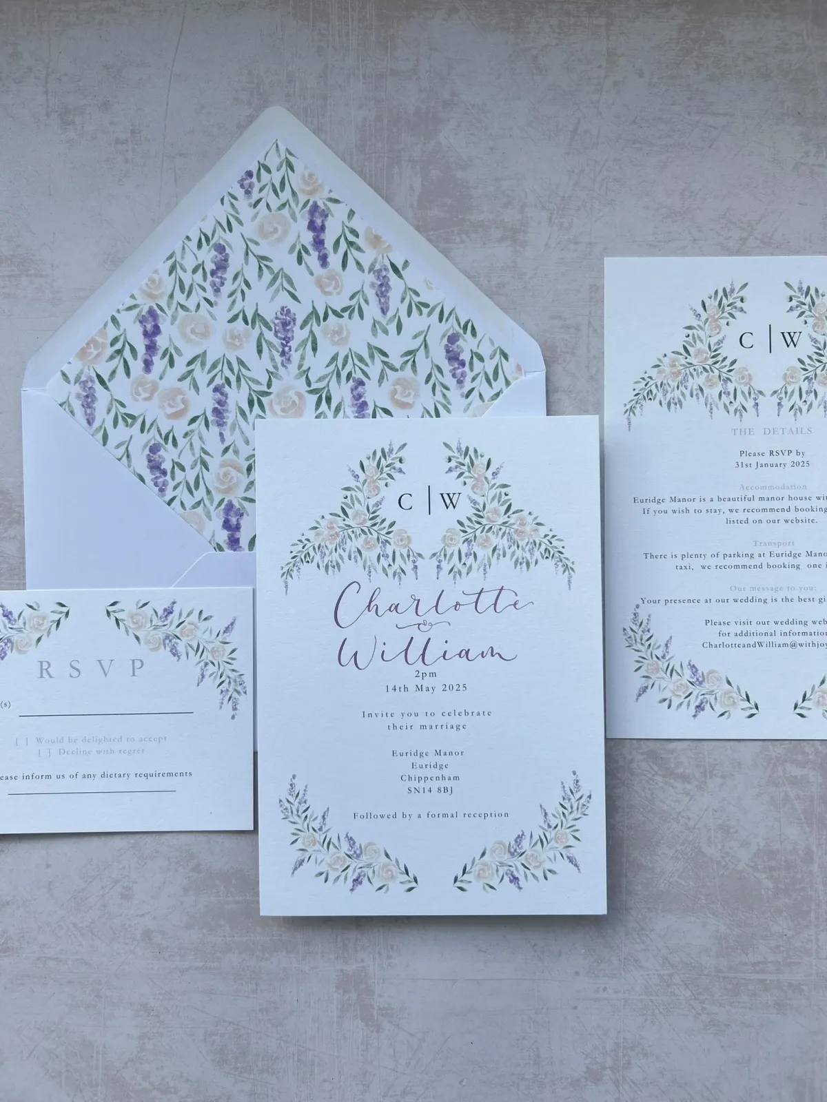 The Wisteria Garden is inspired by the beautiful wisteria we see blooming in May across Britain. The delicate tendrils of wisteria are balanced with dark green leaves and soft pink roses. This suite comes with a number of optional luxury finishes such as hand tied silk ribbon, a wax seal, a printed vellum wrap, envelope liner and hand-lettered gold calligraphy.