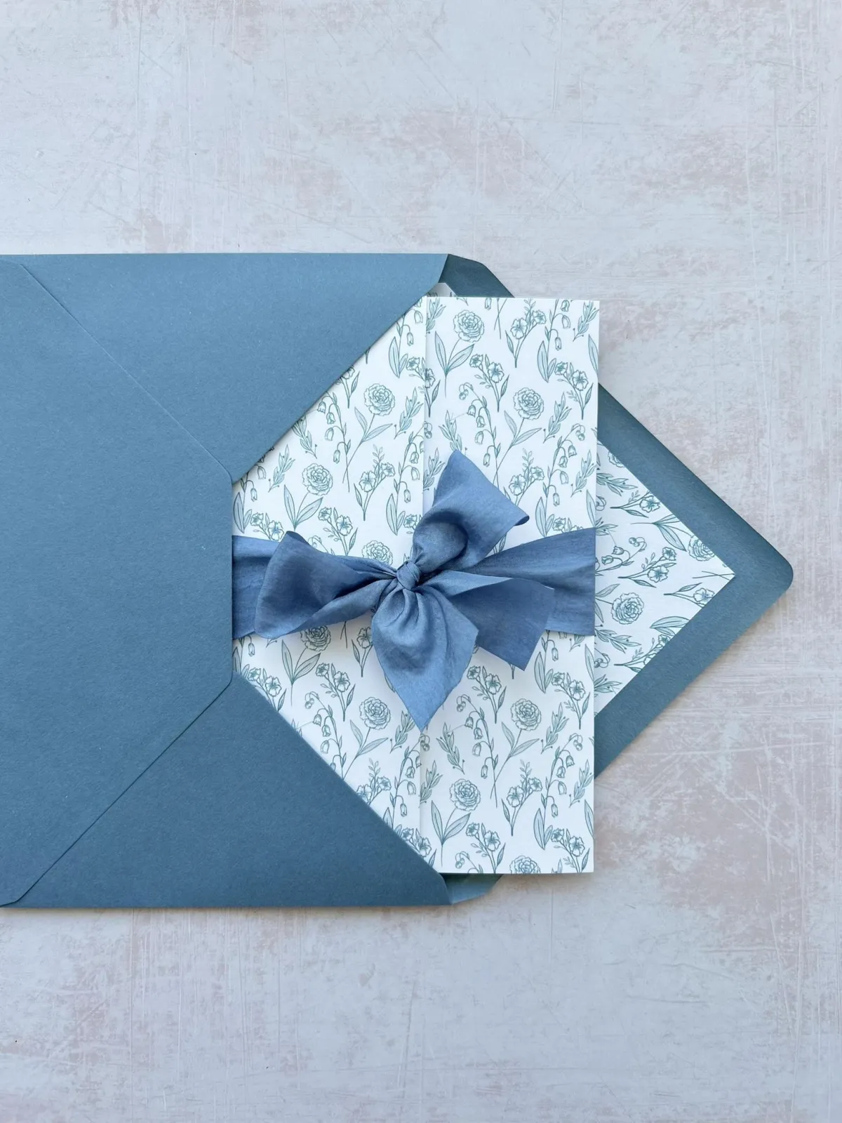 The Cottage Garden Collection features a pretty bow and delicate florals. It has the additional detail of a dotted oval, giving this suite a really pretty and delicate feeling. This suite comes with a number of optional luxury finishes such as hand tied silk ribbon, a wax seal, a printed vellum wrap, envelope liner and hand-lettered gold calligraphy.
